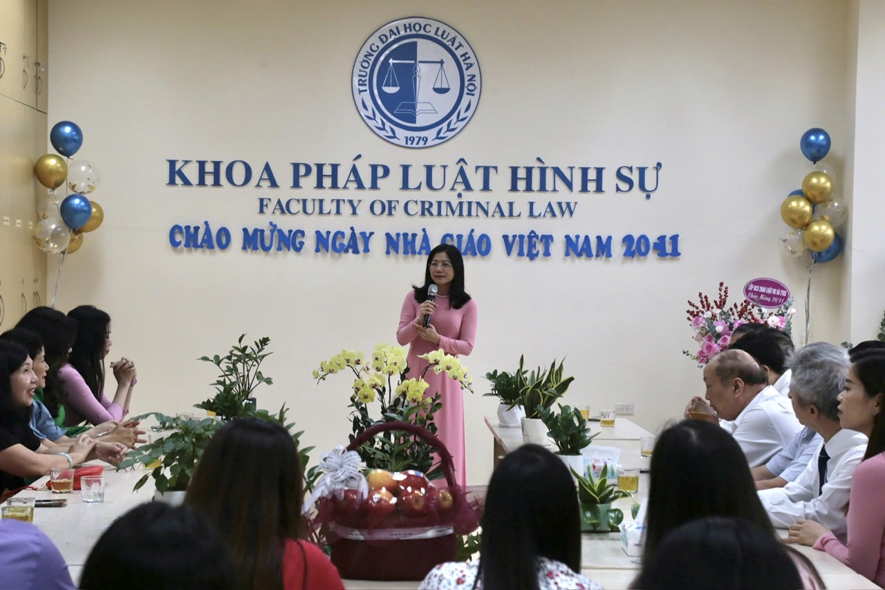Trong cảm xúc ấm áp, chân tình của ngày Nhà giáo Việt Nam, với niềm tự hào về truyền thống vẻ vang của Khoa, PGS.TS. Cao Thị Oanh – Trưởng khoa Khoa Pháp luật hình sự chúc toàn thể các thầy, cô giáo luôn mạnh khỏe, giữ mãi được ngọn lửa đam mê, đoàn kết, nhiệt huyết, yêu Trường, yêu Khoa, yêu nghề và đạt thành tích cao hơn nữa trong công tác giảng dạy và nghiên cứu khoa học. Bên cạnh đó, PGS.TS. Cao Thị Oanh ghi nhận và trân trọng biểu dương thành tích mà các thầy, các cô và người học đã đạt được trong suốt chặng đường đã qua.